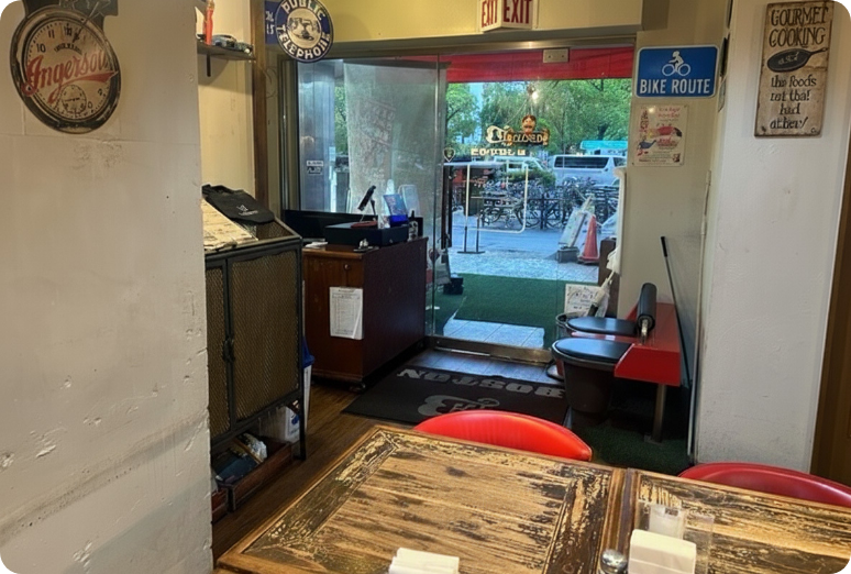 店内は、1952年にビートルズやプレスリーを流す音楽喫茶としてスタートした本店の魂を受け継ぎ、アメリカのダイナーのようなポップな雰囲気。テイクアウトにはない「煮込みスープハンバーグ」も気になるので、次回は店内で食べてみたいです。