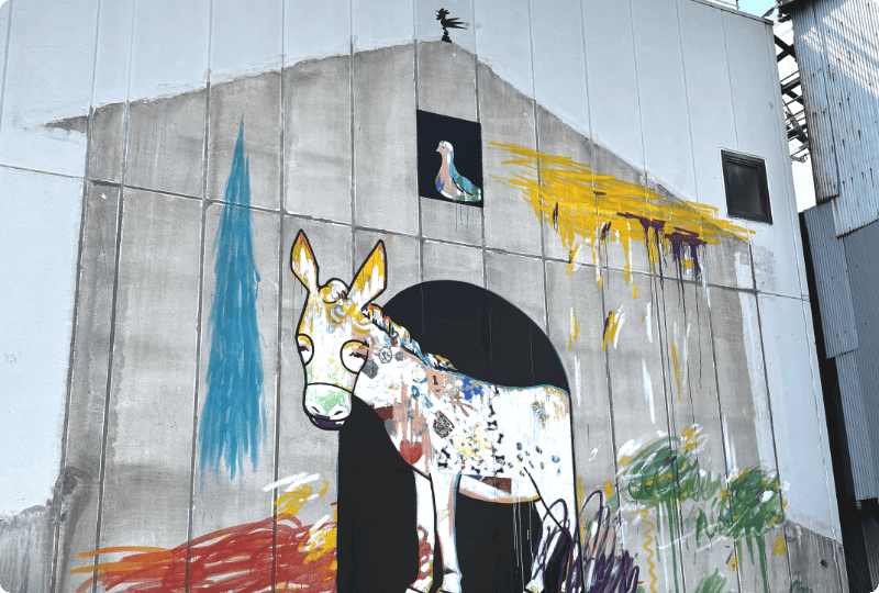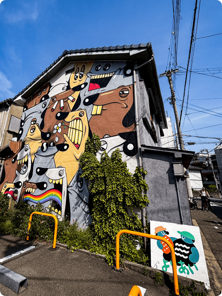 街のあちこちで見かけるウォールアートは、「自分の痕跡を残したい」と、イベントや創作活動で北加賀屋に来たクリエイターたちから始まったプロジェクトだそう。