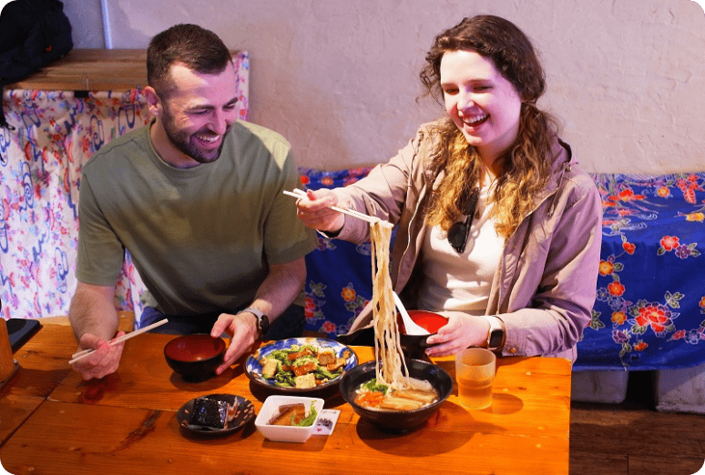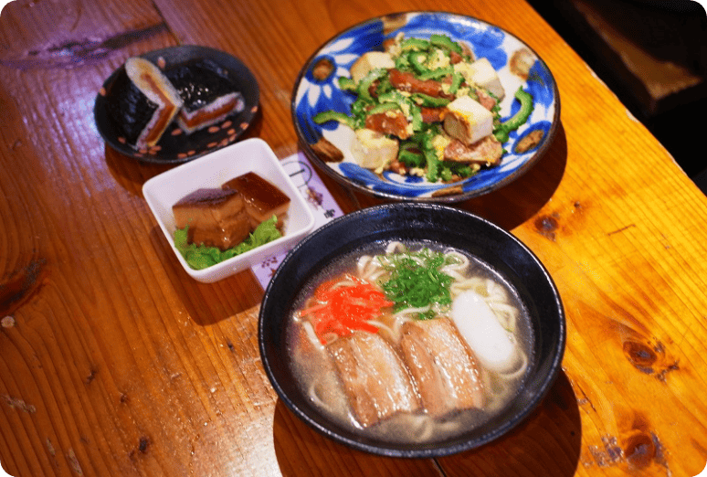 注文したのは名物のゴーヤチャンプルー650円と沖縄そば750円、ラフテー750円、ポーク玉子おにぎり300円。ゴーヤチャンプルにトライしたジョンさんは「ゴーヤの苦味がいいね」とにっこり。疲労回復にも効果があるので、サイクリングの後にはぴったりの料理ですね!
