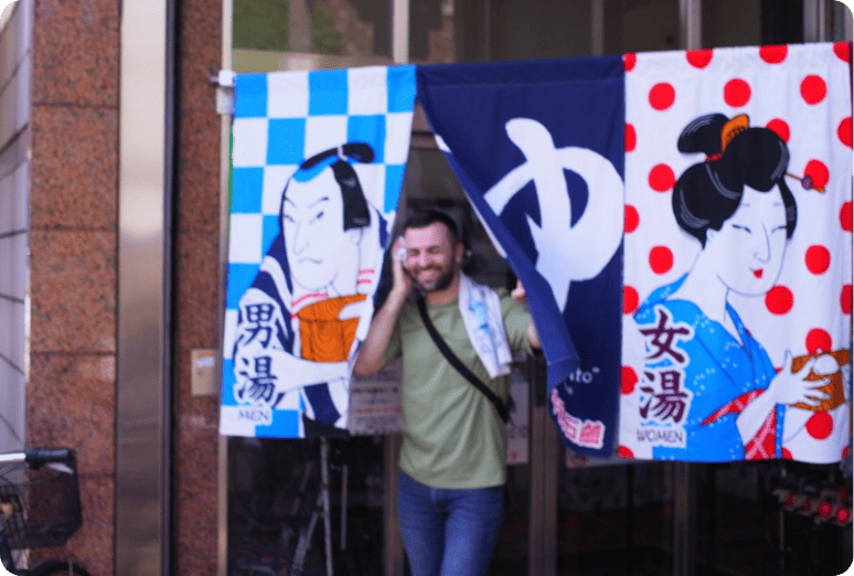 まず、暖簾のポップな浮世絵に感動。ジョンさんにお願いして銭湯から出てきたようなポーズで記念撮影です!