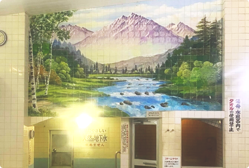 浴室には山岳風景のタイル絵があって、こちらもザ・銭湯といった感じ。温浴施設愛好家の桶美さんによると、ミストの量が多いスチームサウナと天然の地下水を引いた水風呂が特徴なのだそう。