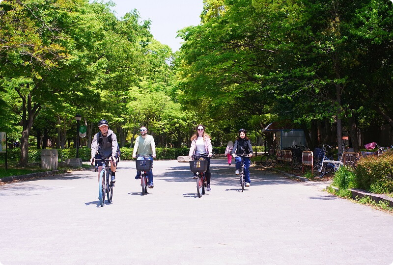 「ワナカコーヒーハウス」から天王寺、阿倍野の中心地を通って長居公園へ向かいます。1400年以上前に建立された「四天王寺」の鳥居を眺め、日本の信仰の歴史に思いを馳せたり。いつもは電車で通り過ぎる街も、自転車で走ると新しい発見があって楽しいですよ!