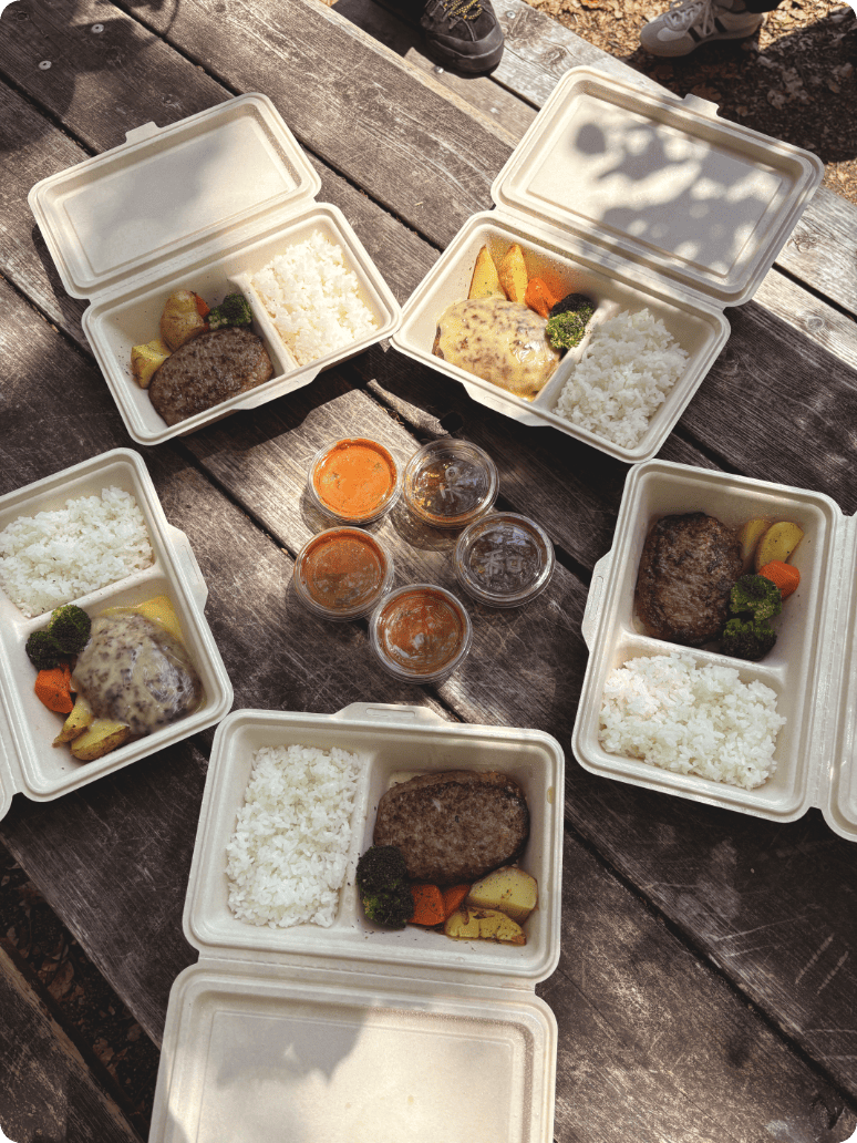 悩みに悩んでデミグラスハンバーグ1,300円とチーズ焼きハンバーグ1,650円、和風おろしハンバーグ1,450円をテイクアウト。お腹がぺこぺこだったジョンさんもこの笑顔!