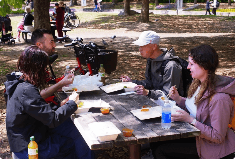 園内をのんびり散走していると、ジョンさんがテーブル付きのベンチを発見しました。これはピクニックにぴったり!近くのお店でお弁当を買って食べることにします。約4,500㎡の芝生スペースでレジャーシートを敷いてお弁当を食べたり寝転がったり、ゆっくり過ごすのもよさそう。