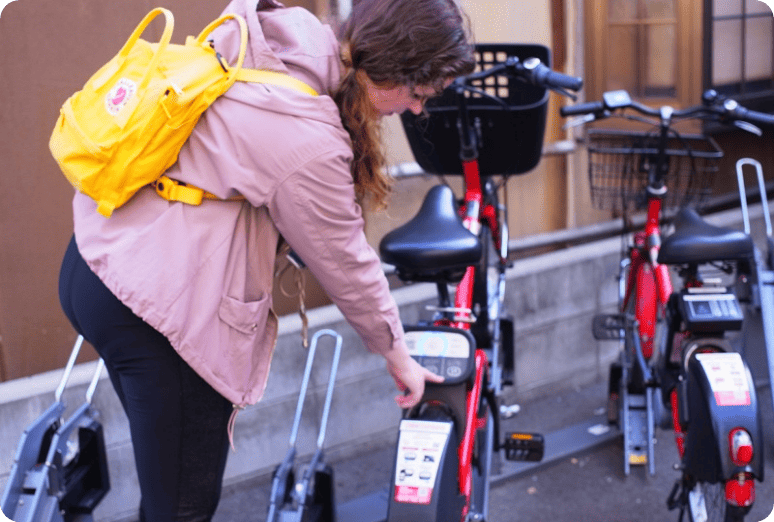 まずは自転車の操作パネルで充電量を確認して、アプリで鍵を開けます。交通系ICカードでもOK。乗る前にブレーキの効きやタイヤの空気をチェックしましょう。開錠から5分は料金がかからないので、不備があったら他の自転車を借りることができますよ。ジョンさんは「思ったより簡単だね」と早速サドルの高さを調節していました!