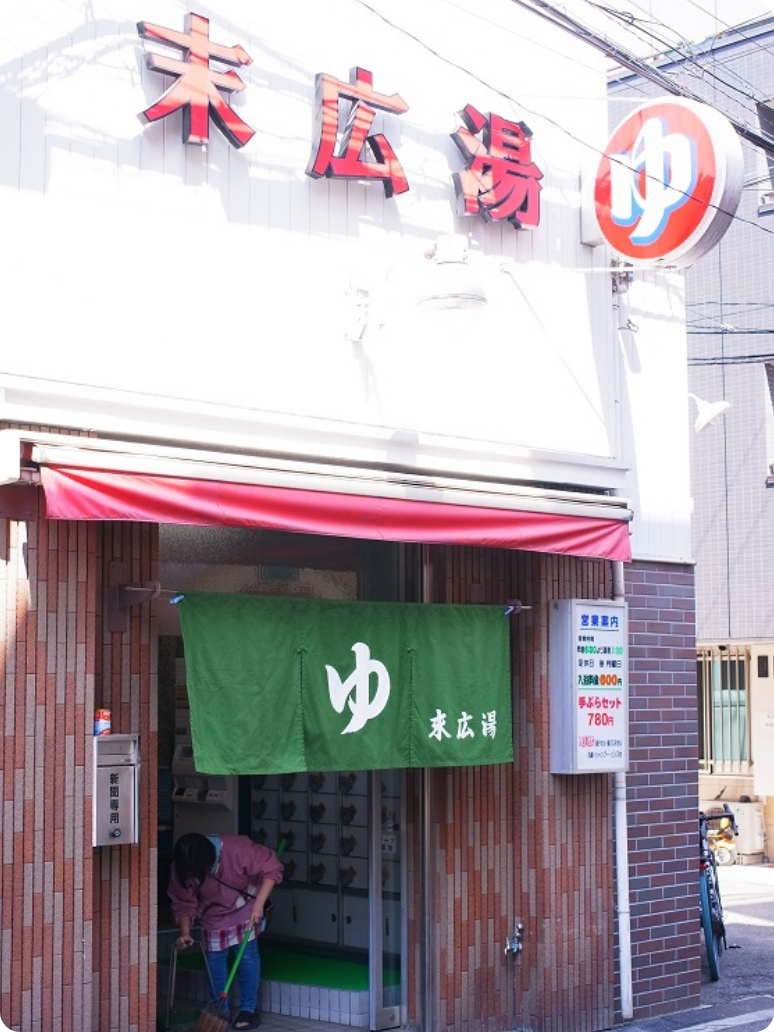 朝9時30分。日本橋を軽く走ると、最初の目的地「末広湯」が見えてきました。既に数台の自転車が停まっていて、地元の人たちから愛されている様子が伝わってきます!
