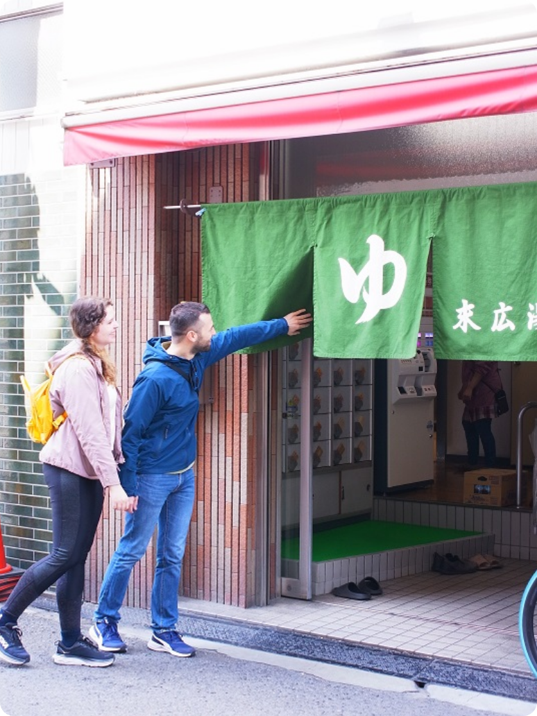 どこか懐かしく感じられる営業時間や料金が書かれた看板。暖簾の先には靴箱や券売機が見えます。スーパー銭湯しか行ったことがないというララさんとジョンさんは、ザ・銭湯な雰囲気に興味津々。「まるでタイムスリップしたみたいだ!」と盛り上がっていました。私も案内に気合いが入ります!
