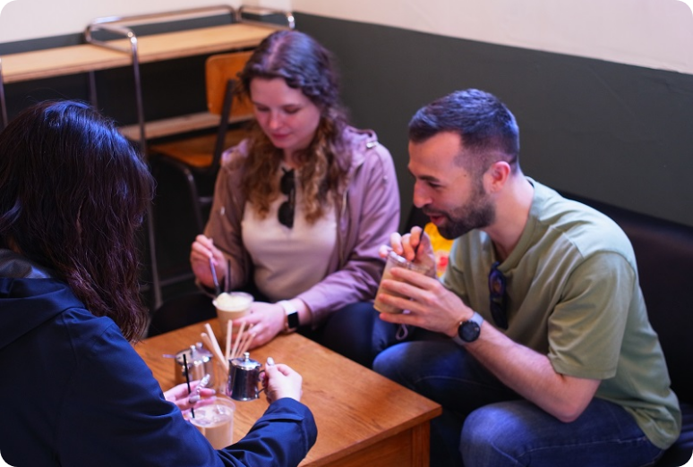 ひとくち飲んで、目を輝かせるジョンさんとララさん。「飲みやすい」「ごくごく飲めるよ」と乾いた喉を潤していきます。笑顔で応対してくれるスタッフと居心地のいい空間が気に入り、ついつい長居をしてしまいました!