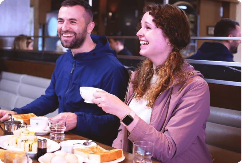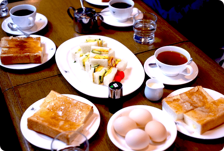 早速、トーストとゆで卵、飲み物のモーニングセット480円とみんなでシェアする用の玉子サンドイッチ710円を注文。モーニングのパンはしっかり厚めで、ワンコインでこのボリュームなのが大阪っぽい。ララさんも「朝食にちょうどいい量ですね」と喜んでいました。サンドイッチは卵焼きが挟まれているタイプ。「玉子がフワフワだね!」と大きな口で頬張るジョンさんを見て、いろんなお店のサンドイッチを紹介したいな、と思いました。