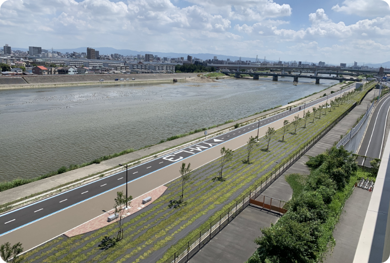 再び自転車を走らせ、咲洲と柏原市をつなぐ全長25kmの「大和川リバーサイドサイクルライン」へ。川からの心地よい風を浴びながら、パノラマの景色が堪能できる絶好のサイクリングロードです。「道が広くて走りやすい」とララさんとジョンさんの評価も上々!